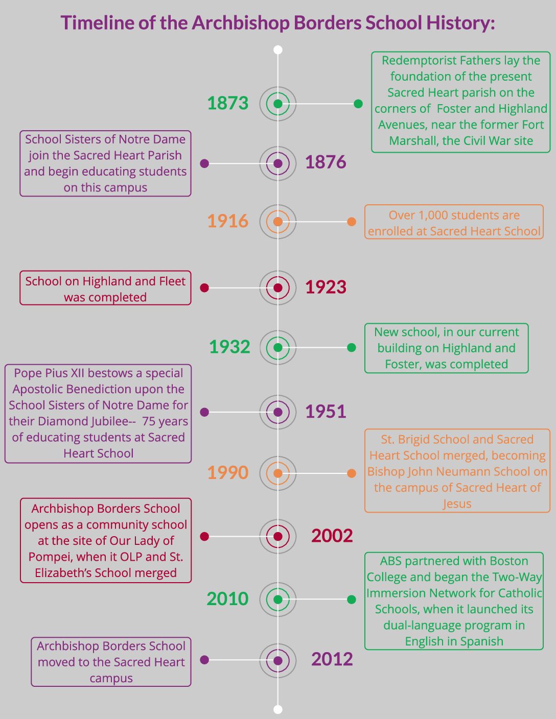 Archbishop Borders School is located on the Sacred Heart of Jesus Parish campus, where the School Sisters of Notre Dame began educating students in the year 1876. By 1916, over 1,000 students were enrolled at Sacred Heart School! Over the past 150 years, the Sacred Heart School was rebuilt, renovated, and expanded multiple times. Our current building was completed in the year 1932. In 1951, Pope Pius XII bestowed a special Apostolic Benediction upon the School Sisters of Notre Dame for their Diamond Jubilee of 75 years of educating students at Sacred Heart School. In 1974, Sacred Heart School, as it was then called, merged with St. Brigid School in Canton to create Bishop John Neumann School. Archbishop Borders School opened as a community school in 2002 in the Highlandtown neighborhood of Baltimore after the merger of St. Elizabeth’s and Our Lady of Pompeii Schools.